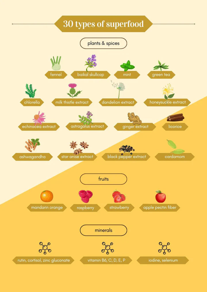 紅桑子、草莓、柑橘果皮提取物 (橙皮苷)、洋蔥素(植物性黃酮醇 / 檞皮素)、西蘭花芽、小球藻、蘋果果膠、蘆丁、八角提取物、蒲公英葉提取物、奶薊草提取物、羅漢果提取物、綠茶提取物、金銀花提取物、茴香、薄荷、貝加爾黃芩提取物、睡茄提取物、甘草提取物、小荳蔻、柑橘生物類黃酮、紫錐花提取物、黃耆提取物、生薑提取物、黑胡椒提取物、天然香料、N-乙醯基、L-麩醯胺酸、L-甘胺酸、L-半胱胺酸、L-半胱胺酸、維生素B6(吡哆醇 HCL)、維生素C(抗壞血酸)、維生素D(膽鈣化醇)、維生素E(D α 生育醇)、鋅(葡萄糖酸鋅)、硒(硒代蛋氨酸)、碘(碘化鉀)。