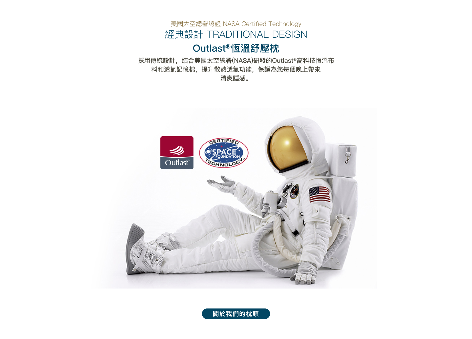 Outlast®恆溫舒壓枕採用傳統設計,結合美國太空總署(NASA)研發的Outlast®高科技恆溫布料和透氣記憶棉,提升散熱透氣功能,保證為您每個晚上帶來清爽睡感。