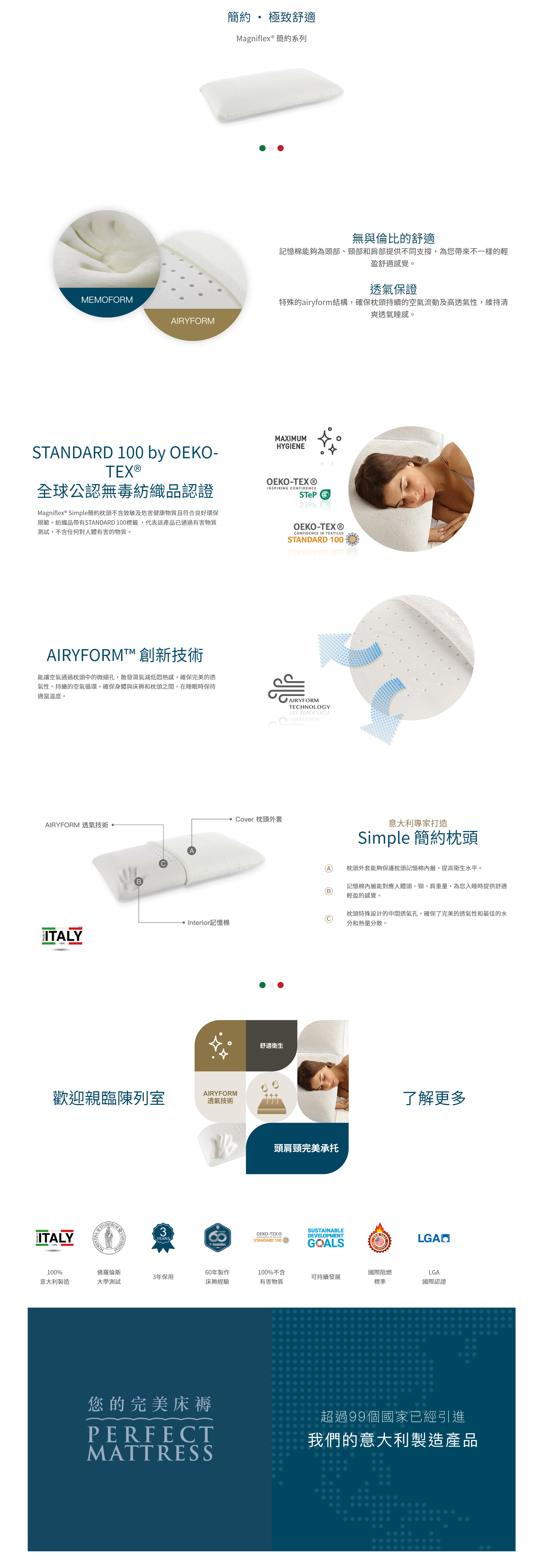產品是結合Magniflex所有基本品質的精緻體現。100%意大利製造,透氣的記憶棉內部有助空氣隨著身體不同的擺動而流動,並有效支撐頸部和肩部,帶來真正非凡的放鬆體驗。