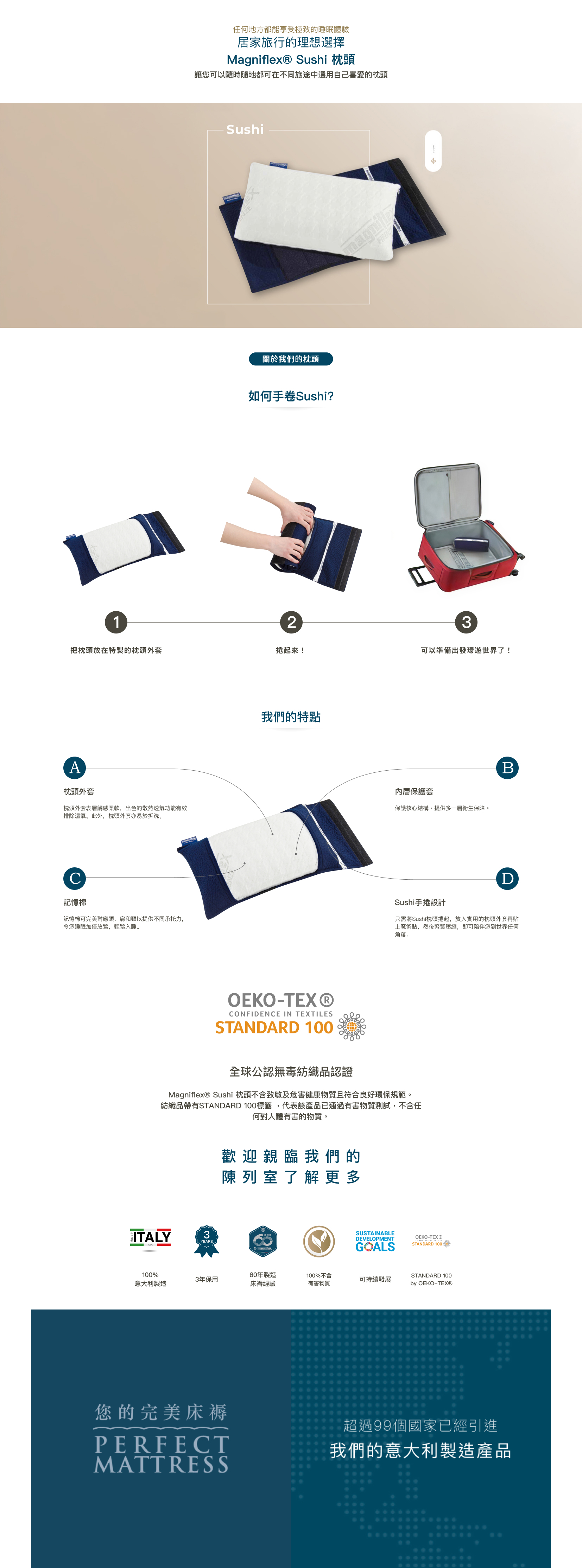 Magniflex® Sushi 枕頭是您居家旅行的理想選擇,讓您可以隨時隨地都可在不同旅途中選用自己喜愛的枕頭。柔軟纖維外套配合Memoform記憶棉,讓您在任何地方都能享受極致的睡眠體驗。
